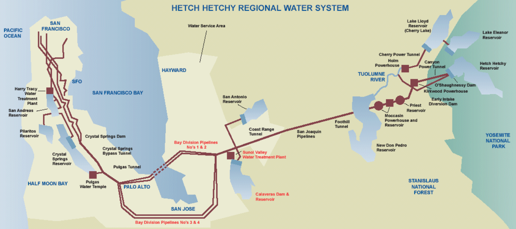 "The regional water system provides water to 2.4 million people in San Francisco, Santa Clara, Alameda and San Mateo counties. Eighty-five percent of the water comes from Sierra Nevada snowmelt stored in the Hetch Hetchy reservoir situated on the Tuolumne River in Yosemite National Park. Hetch Hetchy water travels 160 miles via gravity from Yosemite to the San Francisco Bay Area ... Delivering approximately 260 million gallons of water per day."