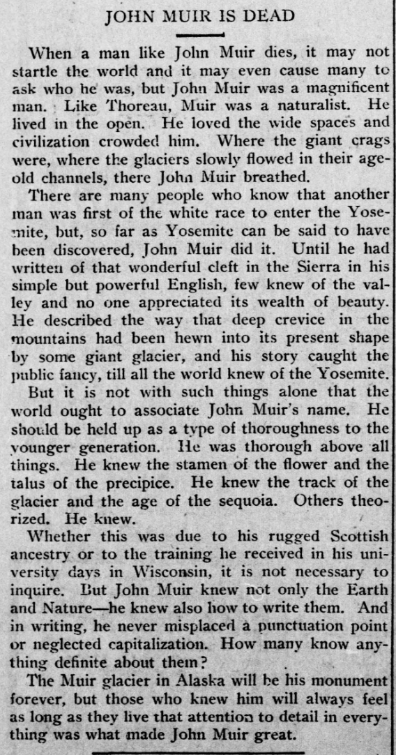 “Of this glorious range the Yosemite National Park is a central section … full of God's thoughts … the deepest sections of the famous canons, of which the Yosemite Valley, Hetch-Hetchy Valley, … grandeur of sculpture.”