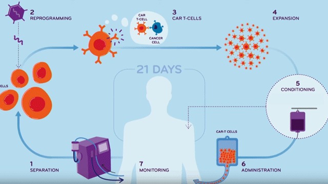 "CAR T-cell therapy is a form of immunotherapy that uses specially altered T cells — a part of the immune system — to fight cancer.When these CAR T cells are reinfused into the patient, the new receptors enable them to latch onto a specific antigen on the patient's tumor cells and kill them."