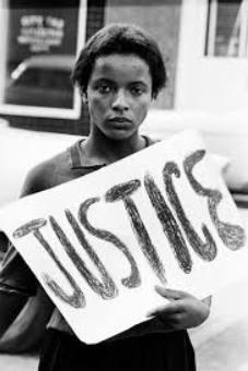 A woman holding a poster that has the word "justice" on it. [Source: Chrysler Museum]